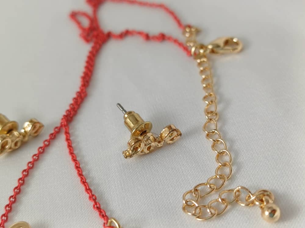 این نیم ست جذاب را می توان هم با استایل اسپرت هم با استایل یک مهمانی ساده و دخترانه استفاده کرد.همچنین یک هدیه مناسب برای کسی که دوستس دارید می تواند باشد. زنجیر قرمز رنگ از جنس استیل می باشد. گوشواره ها در ابعاد 0.5 سانتی متر می باشند.